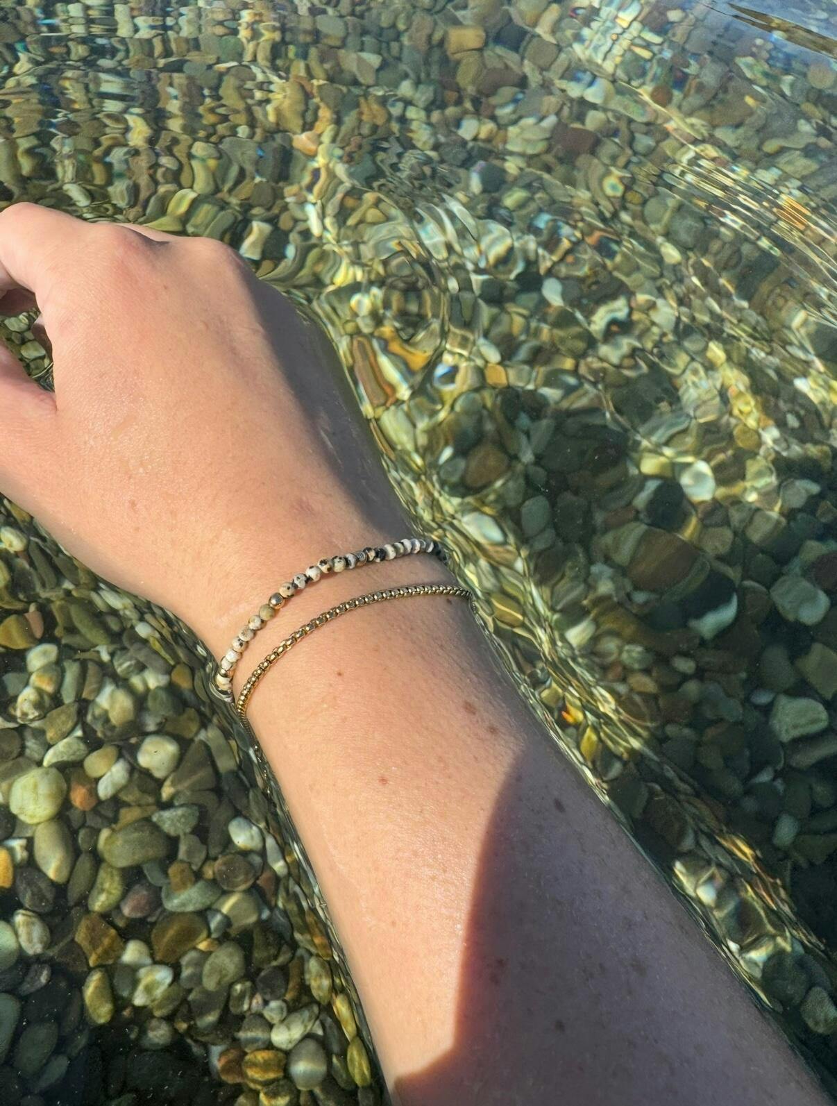 Wie vom Meer geformte Kiesel schmiegen sich die Perlen des Dalmatia Bracelets sanft an dein Handgelenk. Goldene Akzente verleihen dem Design Wärme und Rhythmus – ein Stück Natur, das du immer bei dir trägst.