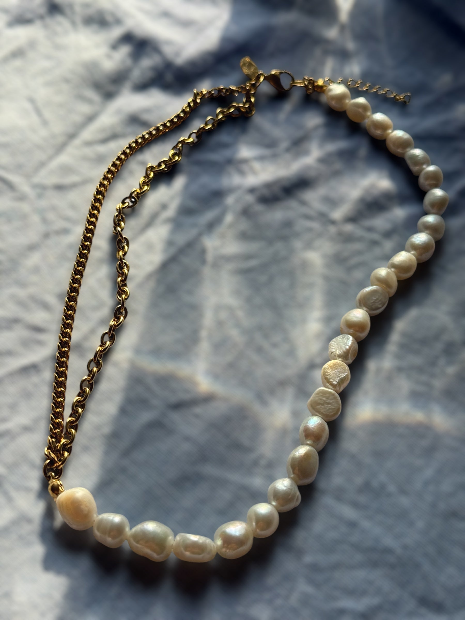 - Design: Zweigeteilte Halskette – feine Perlen & vergoldete Gliederkette