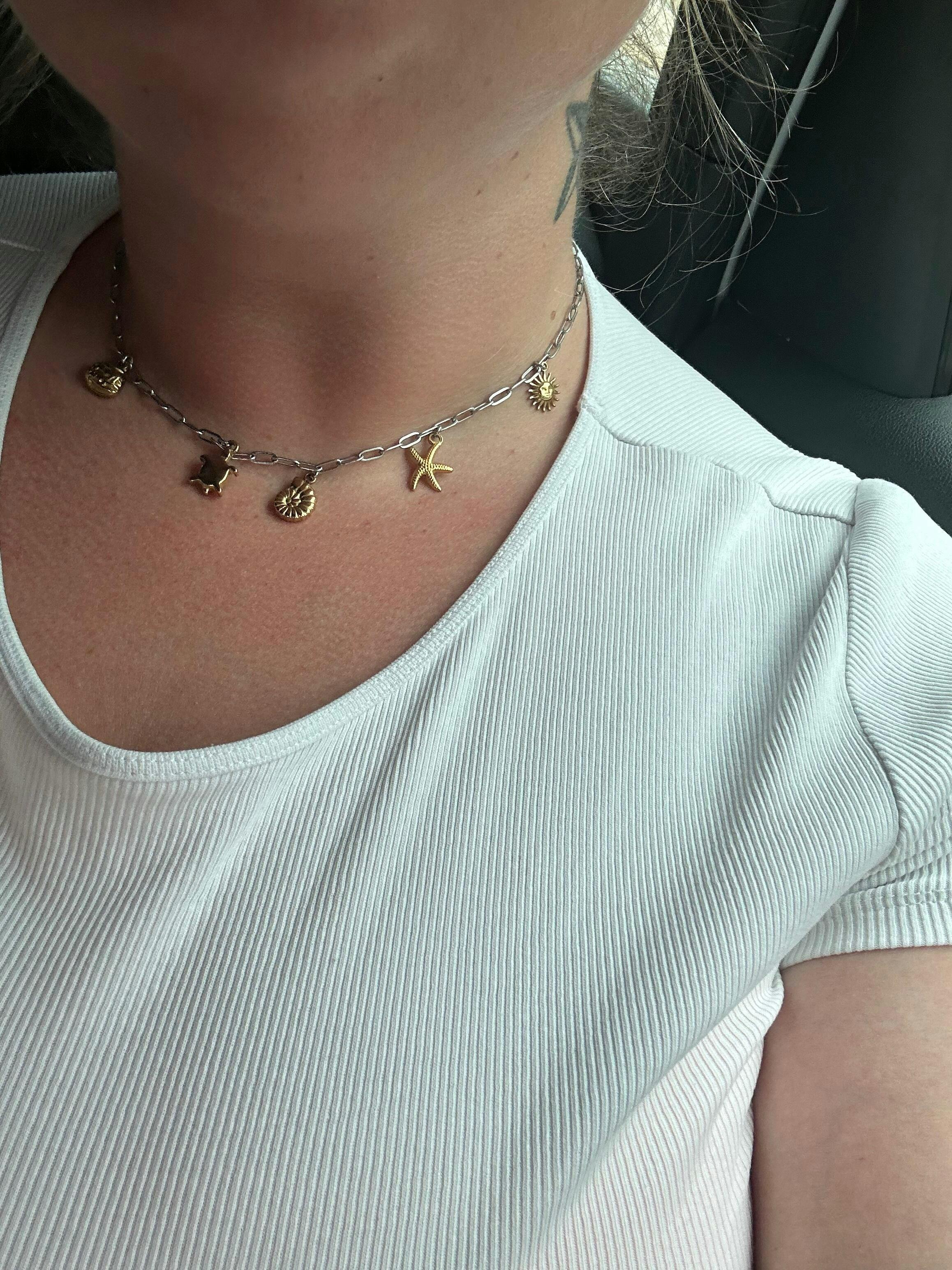 Eine Kette wie ein Tagebuch aus Gold – die Corazón del Mar Necklace trägt bedeutungsvolle Symbole des Meeres an einem filigranen Gliedband: